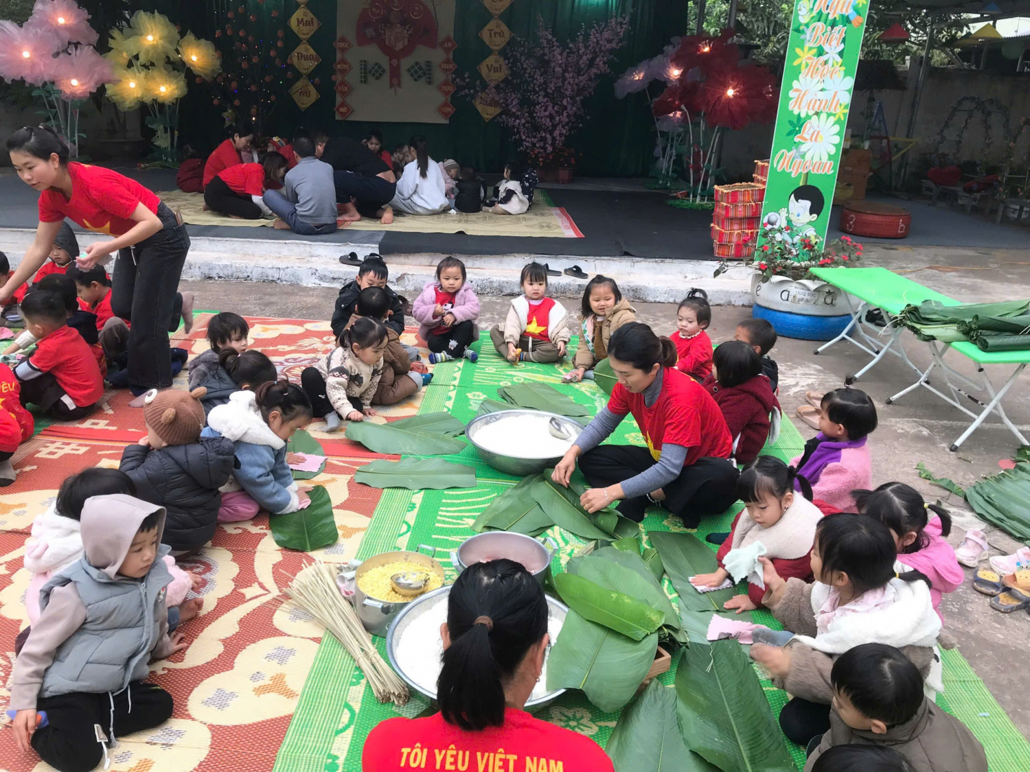 Tại các điểm trường, dưới sự hướng dẫn tận tình của các cô giáo, trẻ được làm quen với các nguyên liệu quen thuộc như lá dong, gạo nếp, đỗ xanh, thịt lợn; được quan sát, lắng nghe cô giới thiệu về ý nghĩa của bánh chưng trong ngày Tết. Các bé vô cùng hào hứng khi được trực tiếp tham gia vào từng công đoạn như rửa lá, xếp lá, cho gạo, đỗ, thịt vào khuôn và cùng cô gói bánh. Dù còn nhiều bỡ ngỡ, nhưng trên khuôn mặt mỗi trẻ đều ánh lên niềm vui, sự thích thú và tự hào.