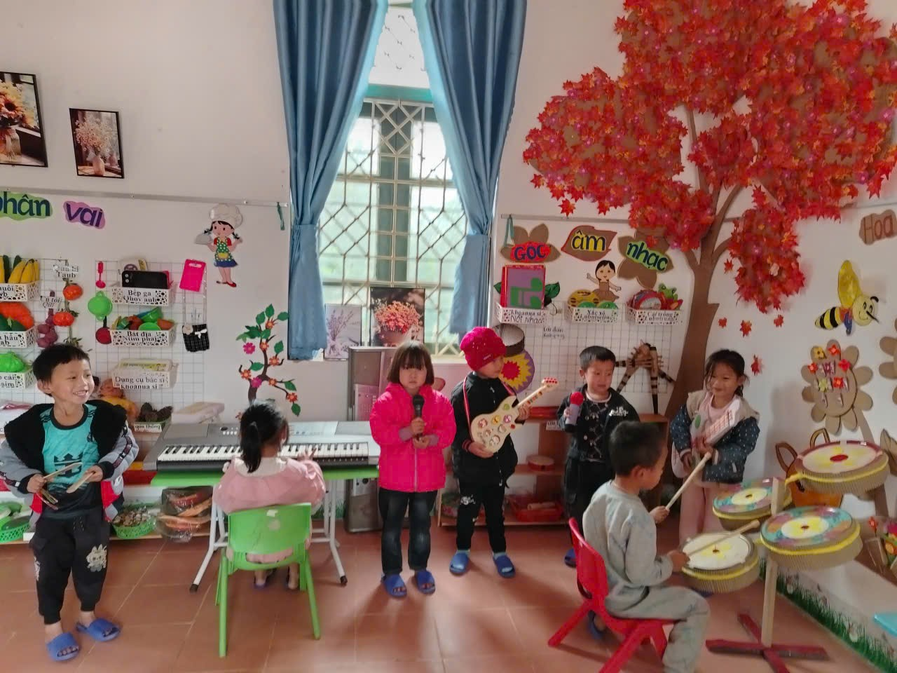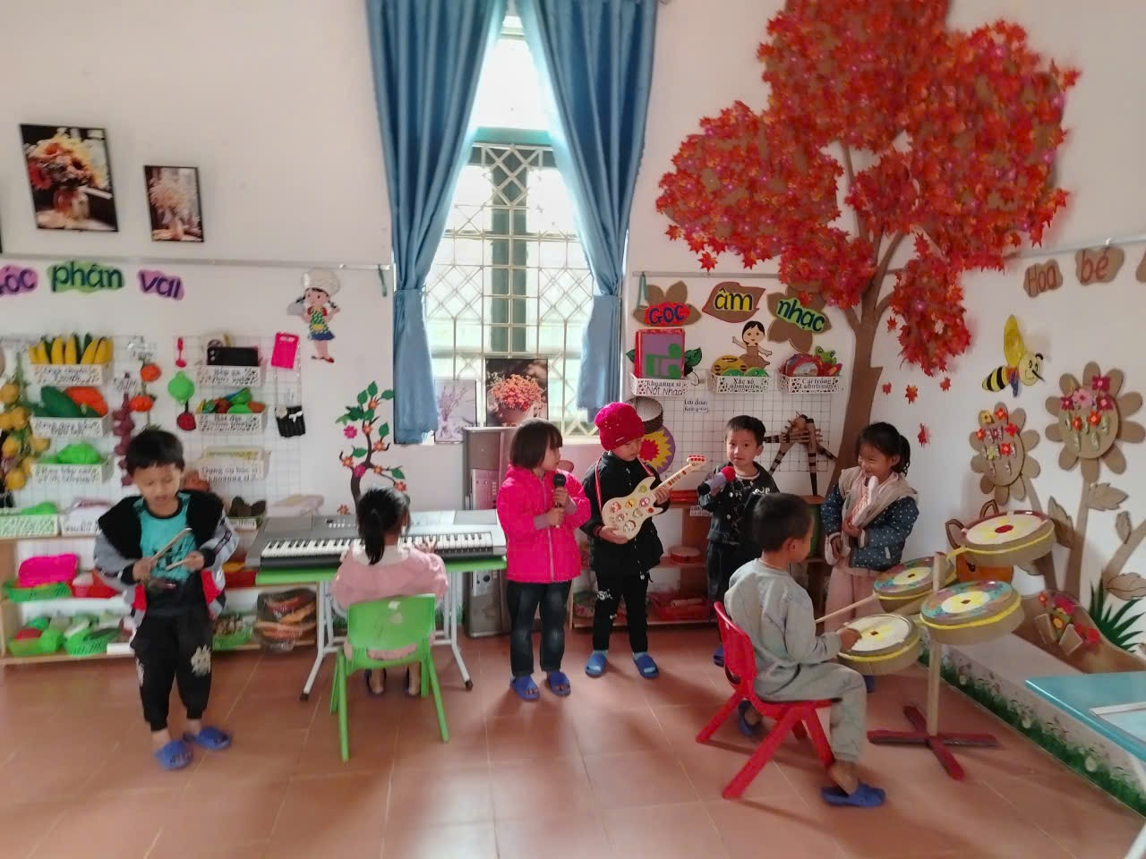 * Chơi hoạt động ở các góc: Đây chính là lúc một xã hội trẻ em được hình thành, bé được đóng vai làm bố, làm mẹ, làm bác sỹ, người bán hàng…Trẻ được chơi cùng nhau, cùng chia sẻ mục đích, ý tưởng chơi, cùng quyết định những gì trẻ muốn chơi. Sau khi chơi xong, các bé chủ động dọn dẹp cùng các cô giáo. Đây là kỹ năng quan trọng mà ở bất kỳ trẻ nào cũng cần phải học.
